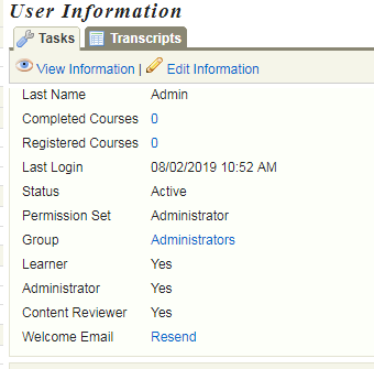 - If you need to view the user’s password or edit any of the information on this screen, select Edit Information under the Tasks tab.